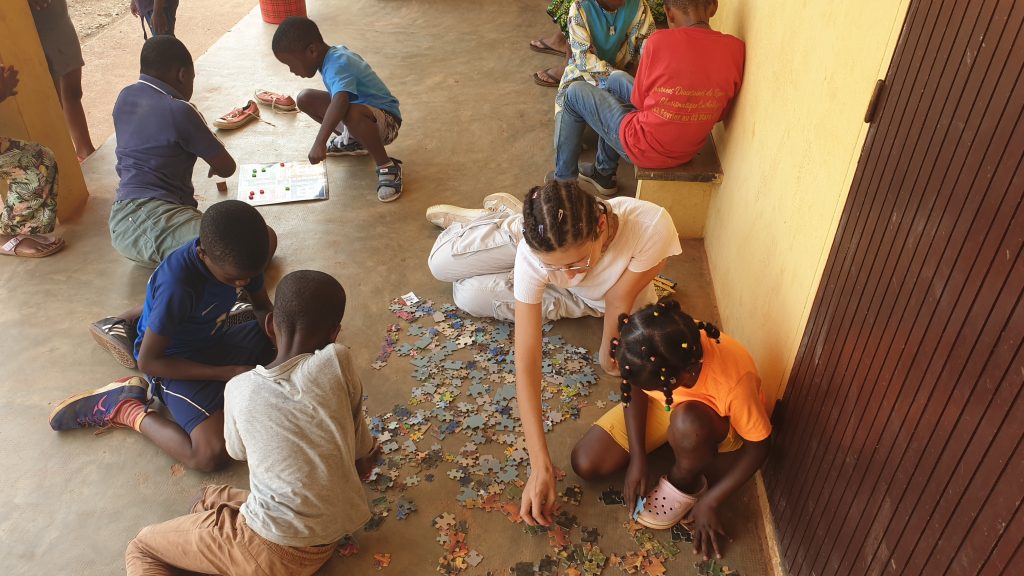 In den Pausen spiele ich mit den Kindergartenkindern, springe Seil mit den Größeren, lese mit den Kindern, die üben wollen oder höre mir ihre Geschichten an. Manchmal kaufe ich mir auch Crêpes mit Schokolade in der Boutique der Schwestern (mmmh) und nutze die Zeit zum Runterkommen. Ansonsten passe ich auf, dass nichts passiert, und bin einfach da.
