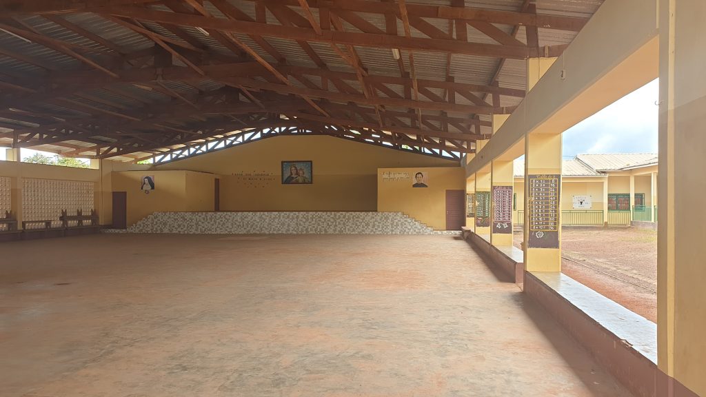 Zeit zum Appell. Eine schrille Klingel ertönt. An die 200 Schüler der 1. bis 5. Klasse springen auf und laufen in die Mitte der Halle, wo sie sich in Reihen aufstellen, nach Klassen sortiert, Jungs und Mädchen getrennt. Eine Lehrerin geht nach vorne, hebt die Hand und die Kinder zählen im Chor nach unten. Bei Null ist Stille (größtenteils). Es folgt die Begrüßung, Lieder werden gesungen, eine Schwester gibt einen kurzen Impuls zum Thema des Monats (im Oktober ist es „solidarité“ – Solidarität), die Kinder beten gemeinsam und montags darf ein auserkorenes Kind die gabunische Flagge im Schulhof hissen, begleitet von der Nationalhymne. Gegenüber warten die kleineren Kinder auf Bänken, machen aber schon eifrig die Bewegungen zu Liedern und Mottos mit und breiten beim Vater unser die Hände aus.