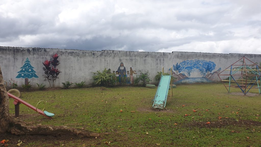 Die Mariendarstellung an der Wand findet man hier überall und sie bezieht sich auf die Marienanrufung „Maria, Hilfe der Christen“. Da die umgangssprachlich „Don-Bosco-Schwestern“ genannten Schwestern eigentlich „Töchter Mariens, Hilfe der Christen“ (Filles Marie Auxiliatrice, FMA) heißen, wird Maria hier so verehrt.